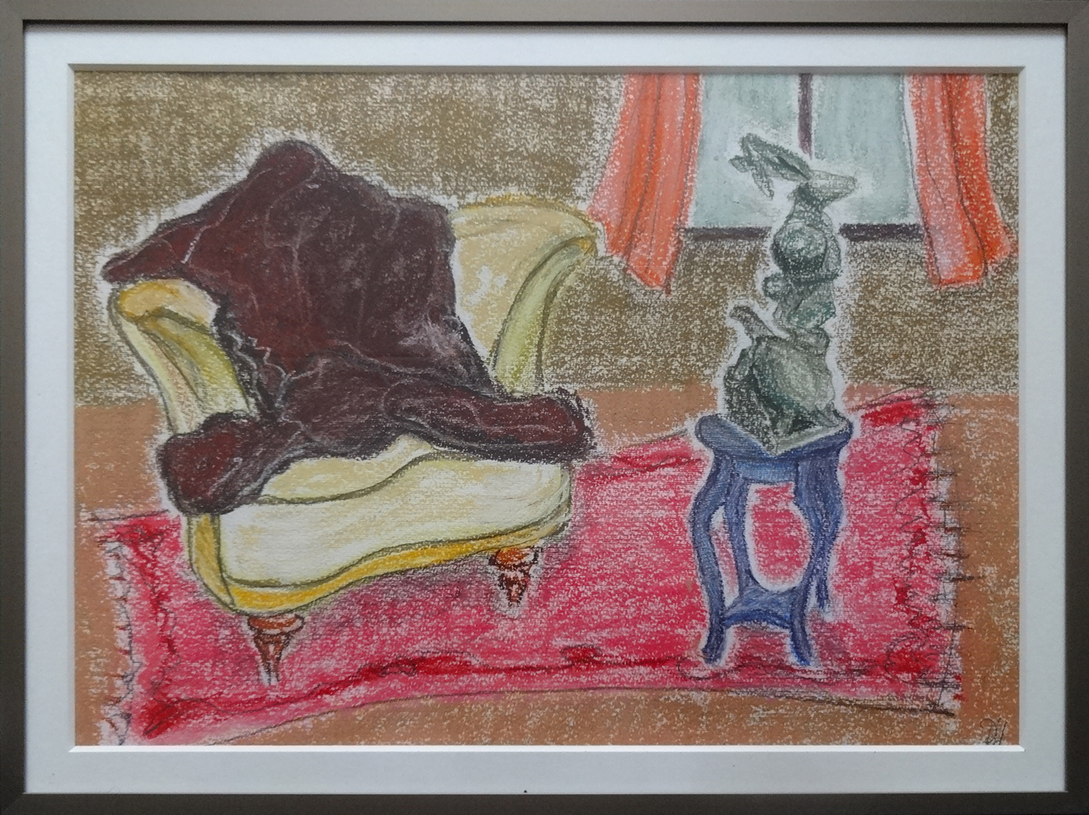 Interieur met stoel, rood kleed en haas, pasteltekening 30 x 40 cm